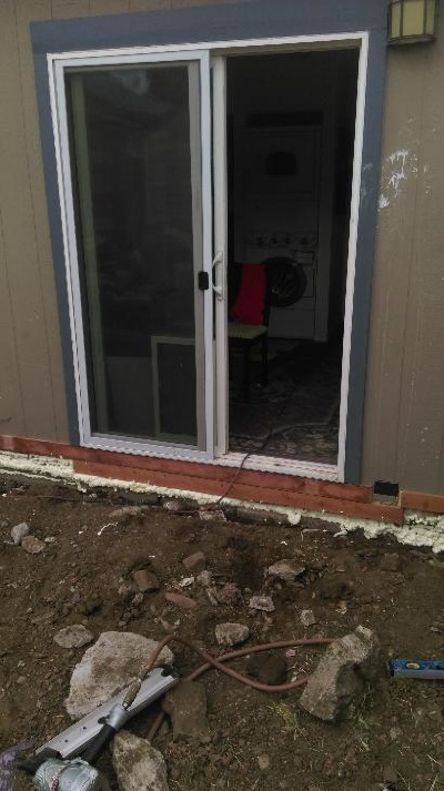 We tore out the concrete to replace it. What we did not know was the extent of the water damage to the frame. A couple of sistered joints and rim in 40 year pressure treated lumber, new flashing and sealants, we could get back to the patio we were hired to do.
