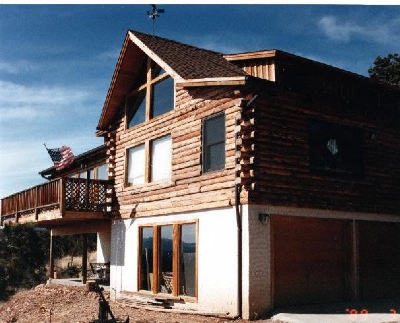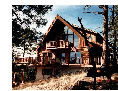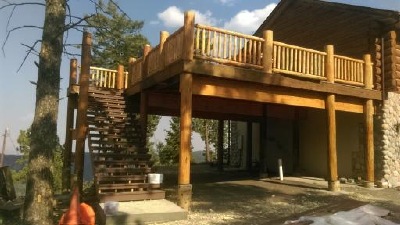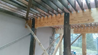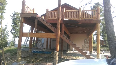 Deck built for 100mph wind load and 115 lb. snow load. Notice the increased centers , saddle cuts and heavy exterior glue lams. Posts were placed to allow for 2 car parking beneath deck. Notice air gap between footings and log posts, I have never replaced a rotten post due to Snow Bear Constructions proprietary methods.