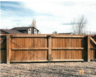 This double wide 16 foot privacy gate allowed owner Scot quick access to his trucks and trailers. On all gates notice the heavy duty gusseted construction and adjustable tension brace on large gates. Heavy 6 X 6 inch posts concreted in.