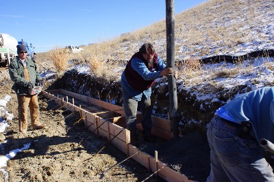 Large commercial concrete footings, formed , reinforced, stepped and being placed. When Snow Bear Construction places footings we take the time to step our footing where our walls step in order to have concrete of wall in contact with footing step for one additional layer to water and vermin.
