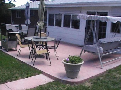 Dyed concrete patio and sidewalk for comfortable summer cookouts.