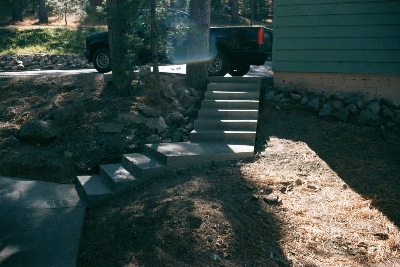 Dave the Owner," 300 pounds of Heavenly Joy","load testing , a free standing stair and patio entrance. This is where flying deck experience is handy. You can't see the reinforcing and large footing under bottom stair to hold structure in place. We had set imbeds in slab and steps and later placed wrought iron rails.
